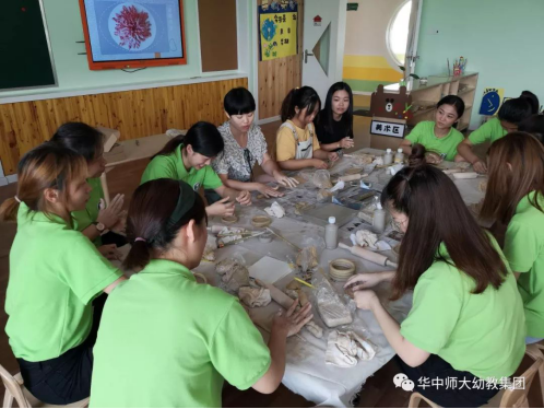 接下来,裴小月老师给老师们讲解了陶艺的创想和实操。陶艺对于老师们来说是一个陌生的课程,大家都充满了好奇,欣赏完华师幼儿园老师和小朋友们的作品,大家在裴老师的指导下也尝试着用泥条立筑各种造型,所有人都沉浸在陶艺的乐趣中。