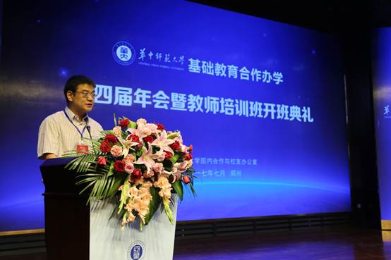 7月6日,华中师范大学基础教育合作办学第四届年会暨教师培训班在郑州隆重召开,郑州市人民政府副秘书长柴丹携郑州市二七区相关部门负责人郑州市委宣传部副部长市委网信办主任石大东、郑州市二七区区委副书记王玉红、二七区常委宣传部长刘利、二七区政府党组成员黄卫红出席会议,华中师范大学副书记骆军携学校相关职能部门负责人出席会议。合作办学区域内政府领导、合作区域内相关企业领导、基础教育合办学校校长及培训教师300余人参加了会议。
