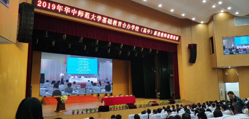 2019年7月17日—21日,华中师范大学基础教育合作办学暑期(高中)新进教师培训在湖北潜江举行。17日下午,培训班开班典礼在潜江附中举行,华中师范大学合作办副主任肖志刚、合作办学主管代薇,潜江市教育局副局长伍孝江,华中师范大学校董朱红岩先生,华中师范大学教师教育学院副院长董中锋教授,湖北省高级心理咨询师耿喜玲教授出席了开班典礼,来自华中师范大学基础教育合办学校的两百名新进教师、当地新入职教师以及学生家长参加了此次开班典礼。开班典礼由华中师范大学潜江附属中学校长洪顺刚主持。
