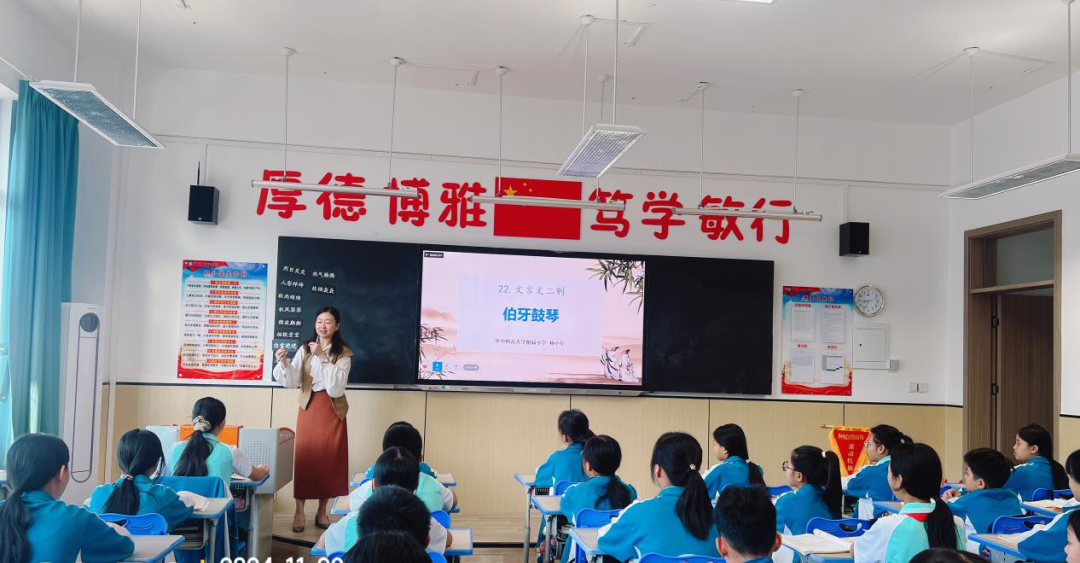 华中师范大学附属小学语文教师杨小军执教文言文《伯牙鼓琴》。杨老师把知文意、悟感情巧妙融合在一起。通过老师范读,引导学生通过想象,读出山的高大和水的浩荡。通过反复品味文字,不断加深学生理解,触类旁通,拓展延伸,让同学们在情境中学会运用。