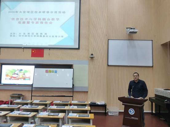 为深入推进信息技术课堂教学改革,切实提高教师信息化教育教学水平,进一步提升教师队伍的专业素养,2020年10月21日,华中师范大学附属惠州大亚湾小学成功举办了由大亚湾区宣教局主办,华中师范大学附属惠州大亚湾协办的“信息技术与学科融合”校本研修示范课活动,出席本次活动的领导和专家有:广东省中小学教师信息提升工程专家,惠州市第八中学教信息中心主任张朝晖、大亚湾区宣教局教育科副科长李子青、大亚湾宣教局培训中心主任徐法胜、大亚湾区宣教局教育科干事叶伟豪,我校校长罗晓、党支部书记何冰森、副校长黄国臣及全区200余名教师参加了本次活动。会议由徐法胜主任主持。