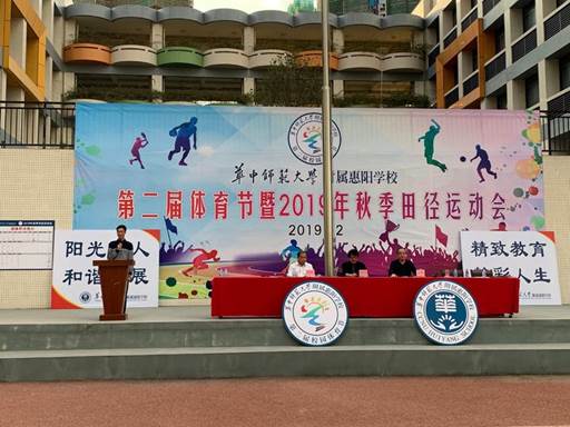 青春与阳光共舞,运动与激情同在。为了丰富校园文化生活,推进阳光体育运动,12月18日我校隆重举办了第二届体育节暨2019年秋季田径运动会。惠阳附属学校付涛副校长主持运动会开幕式。庄严的国旗队、鲜艳的彩旗队、各班级方阵伴随着雄壮的运动员进行曲,身着整齐的服装,迈着矫健的步伐,高喊口号,精神抖擞地步入会场,一幅"一枝独秀不是春,百花齐放春满园"的盛景。在庄严的升旗仪式后,运动员代表彭锦豪同学、裁判员代表黄茂嵘老师分别宣誓。王仕武校长致开幕词并宣布“华中师范大学附属惠阳学校第二届体育节暨2019年秋季田径运动会”开幕。