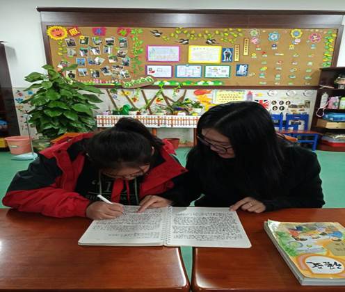 语文组高老师指导撰稿学生段敏倪一丝不苟地修改征文。