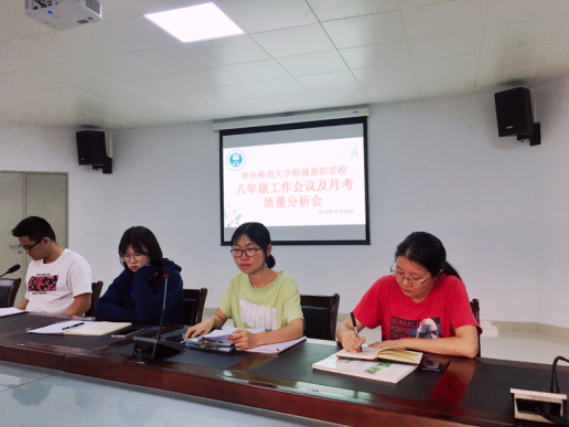 首先八年级班主任介绍班级管理现状及各学科老师对各自所带学科进行了系统分析,从各学科的主要成绩、存在的问题、对策进行了细致的分析,并提出了阅读习惯的培养、分层指导、一帮多、少批评多鼓励等具体改进措施。