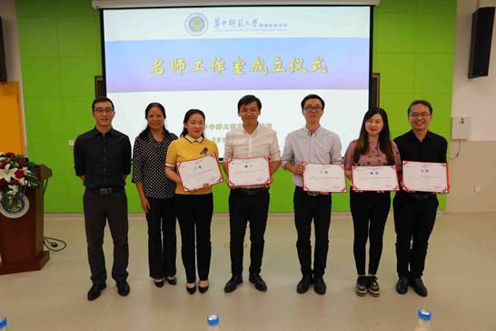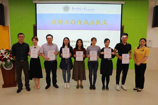 名师工作室成立仪式举办。首届名师工作室主持人有李建国、赵查、陈婷婷、何平、刘红云、危雄、谢晶,张丽清校长为名师工作室首届主持人颁发证书并合影留念。