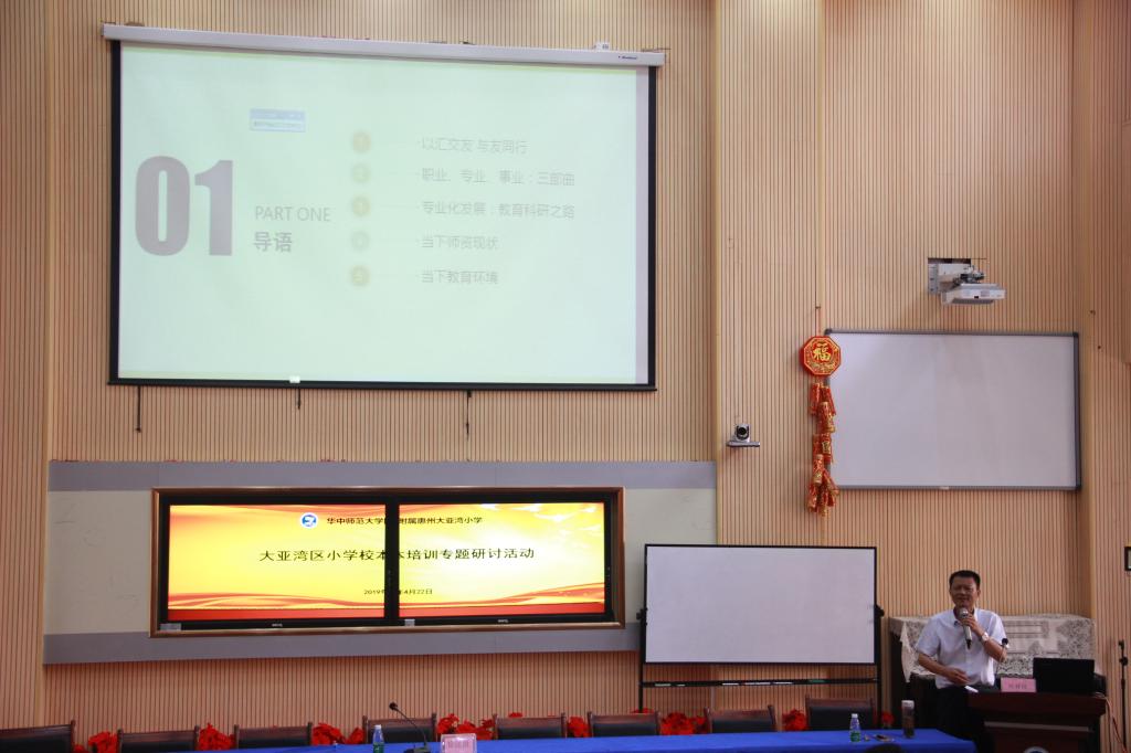 2019年4月22日上午,华中师范大学附属惠州大亚湾小学校长叶祥佳在我校二楼报告厅作了《当下教师专业发展的培养路径》的专题报告,国家督导专家胡甫清、湖北省学校文化研究中心副秘书长谢向阳、大亚湾区宣教局徐法胜同志,以及大亚湾区兄弟学校的二十余位校长参加了本次活动。