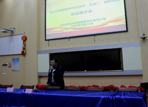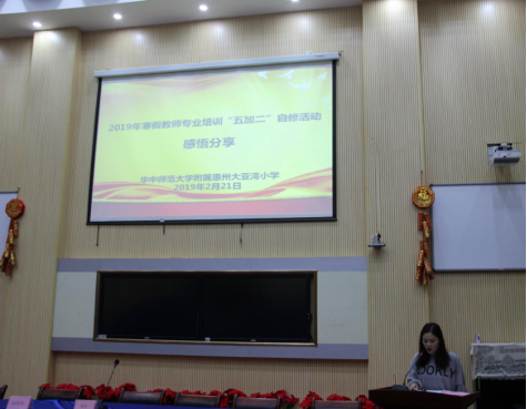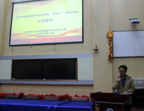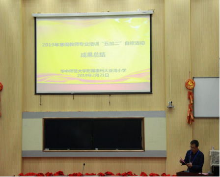 华中师范大学附属惠州大亚湾小学全体教师于2019年2月21日下午在校学术报告厅举行了2019年寒假教师自修“五加二”培训交流展示活动。“五加二”自修培训活动,即阅读一本教育专著、撰写一篇文章、撰写一篇教学设计、练写一手好字、练习一项才艺;制订一份学科期末考试测试卷、完成学校下发两份期末试卷。这是附属惠州大亚湾小学为了提高教师素养、促进教师专业化成长,全面提高教师实施素质教育的能力和水平而为教师制定的寒假培训活动。