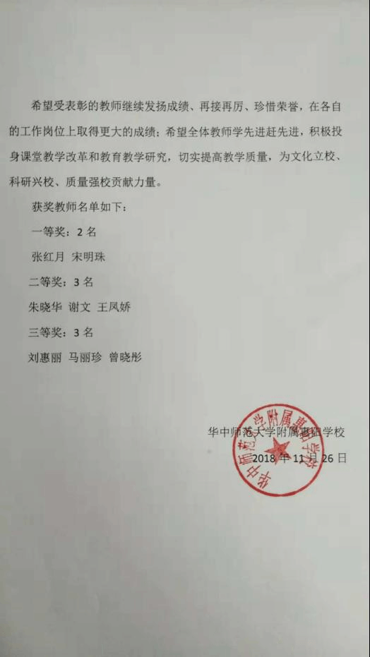 为提升我校教师教学教研水平,促进教师专业成长,我校特举办了新入职教师“达标课”竞赛活动。经评委认真评审,评出一等奖2名,二等奖3名,三等奖3名。11月26日下午,隆重的颁奖仪式在欢快的音乐声中进行,校领导先后为获奖教师颁发获奖证书及奖金。