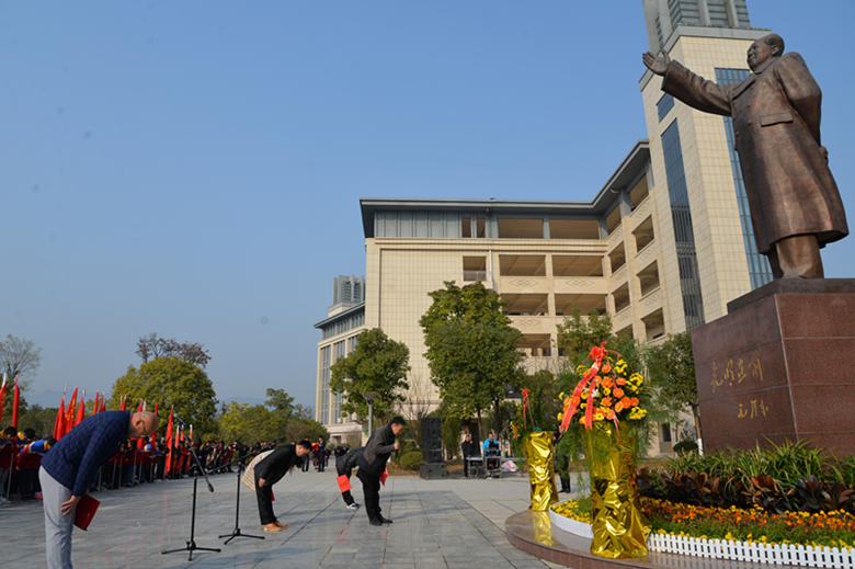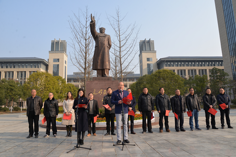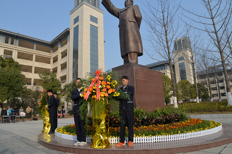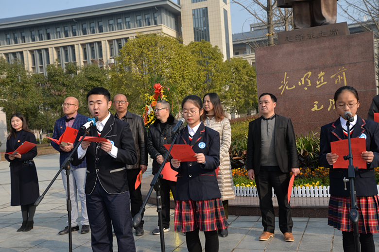 怀着一份对毛泽东的崇拜与怀念、一份对历史的回忆和反思,主持人带领大家一起回顾了毛主席的生平事迹。伴随着雄壮的国歌,校国旗班成员向屹立在广场中央的毛泽东铜像敬献了花篮。全体党员教师和学生团员分别在鲜红的党旗和团旗前重温誓词。校长束华山带领大家庄严地向毛主席铜像三鞠躬;李勃老师的一首原创诗歌《您,没有走!》,道出了我们对毛主席深深的思念和崇敬之情;学生代表的激情演讲,表达了我们对无数伟大无产阶级前辈们的崇高敬意!李江陵校长与学生代表联颂的《沁园春·长沙》,激情澎湃、热血沸腾。