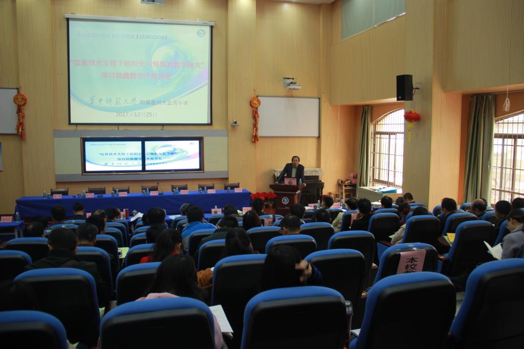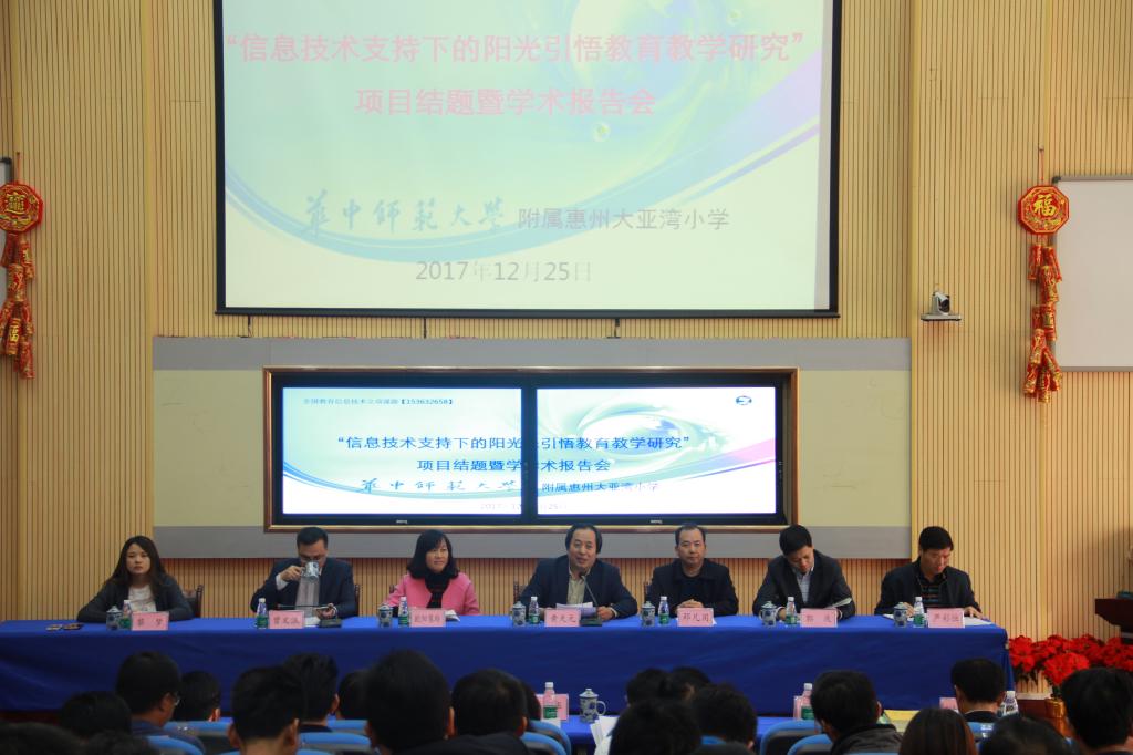 2017年12月25日下午,华中大亚湾附小举行了全国信息技术立项课题“信息技术支持下的阳光引悟教育教学研究”结题报告会。会议邀请了中央电化教育馆研究部主任黄天元;广东省电教馆发展研究部副主任欧阳慧玲;惠州市电教站站长梁惠专;徐州市电化教育馆馆长周岩;深圳市电教馆原馆长谢华;国家督导专家胡甫清;大亚湾宣教局教研室副主任郭永华组成了评委小组。华中师范大学合作办副主任郭庆;惠州市教育局副局长邓凡用;大亚湾宣教局局长曾文浪;湖北省学校文化研究中心副秘书长谢向阳等领导与专家莅临现场指导结题,与会的还有大亚湾兄弟学校的校长及老师。