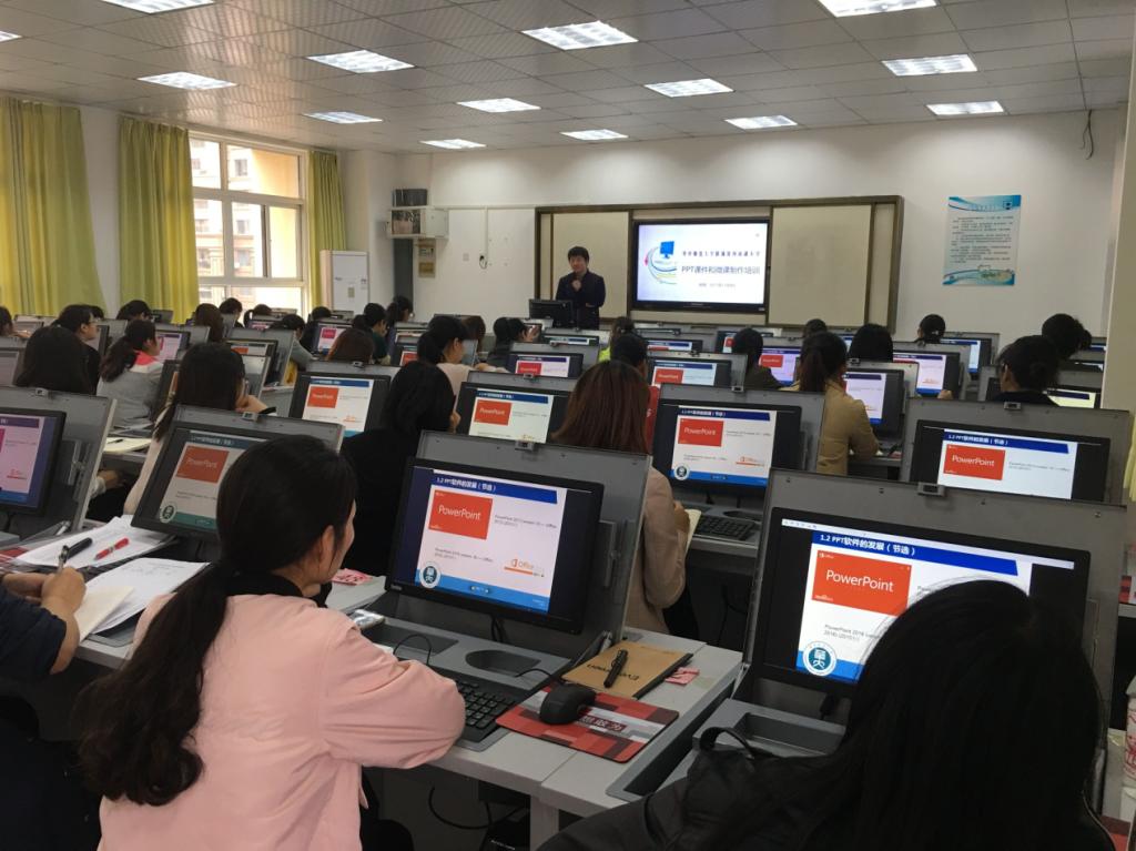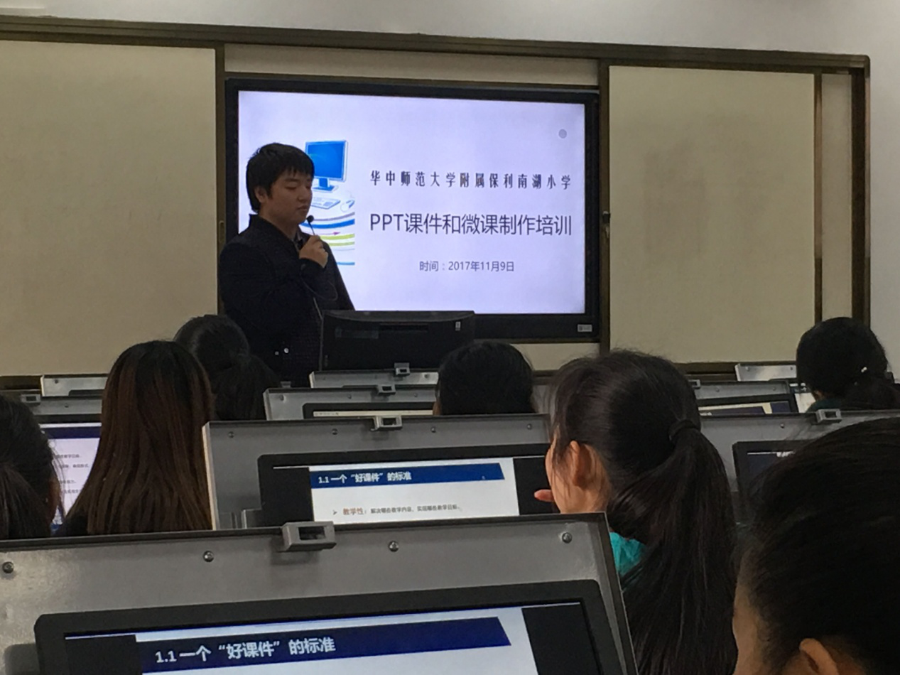 为了更好地开展教育教学活动,有效地利用多媒体资源,让每一位老师能熟练地将现代教育手段运用到课堂教学中,打造丰富有趣的小学课堂,2017年11月10日下午,附属保利南湖小学组织全校教师在学校机房进行ppt课件和微课制作培训。