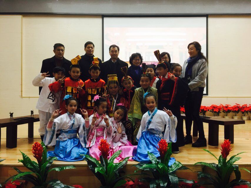 专家评估组、王校长和小演员们合影
