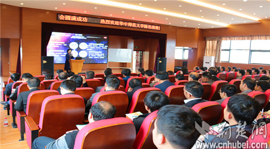 图为:华中师范大学附属梧桐湖学校校长叶枫岚作报告