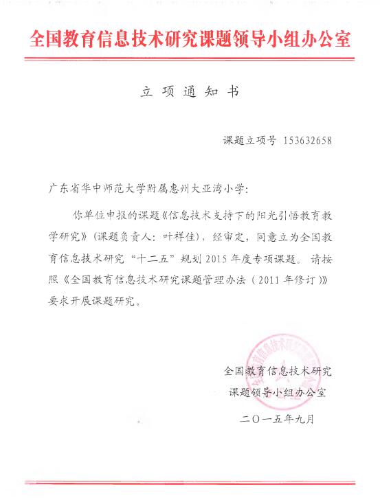 2015年9月,华中师范大学附属惠州大亚湾小学“信息技术支持下的阳光引悟教学研究”被国家教育信息技术研究课题领导小组列为“十二五”规划2015年度专项课题。此项国家级课题立项,是附小建校以来的首个国家项目。