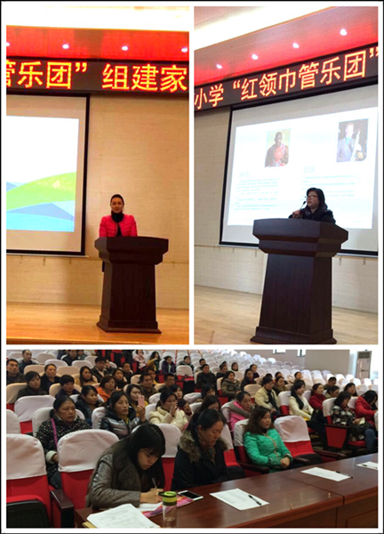 团市委向娅丽部长、武汉东湖风景区文教局孙继安书记、大雅乐盟李松董事长等领导为“红领巾管乐团”的启动仪式致辞并为团员赠送乐器。