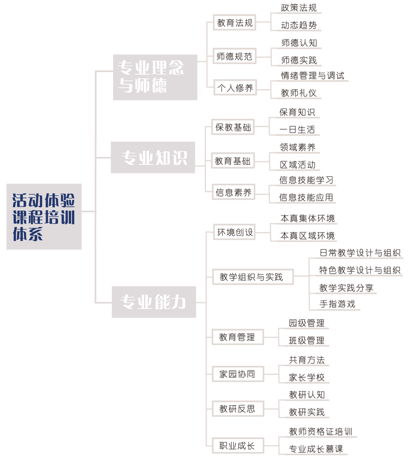 活动体验课程培训体系多途径整合优质培训课程资源,从“专业理念与师德”、“专业知识”、“专业能力”3个模块明确幼儿教师业务知识和能力,围绕12个专题,26个子专题层层助推课程落地,培训形式灵活多样,培训内容紧密贴近一线教师实际工作需求,培训对象覆盖幼儿教师、幼儿园园长,促进整体教师队伍素质提升。